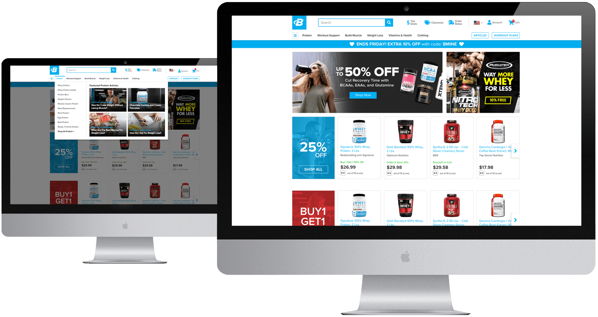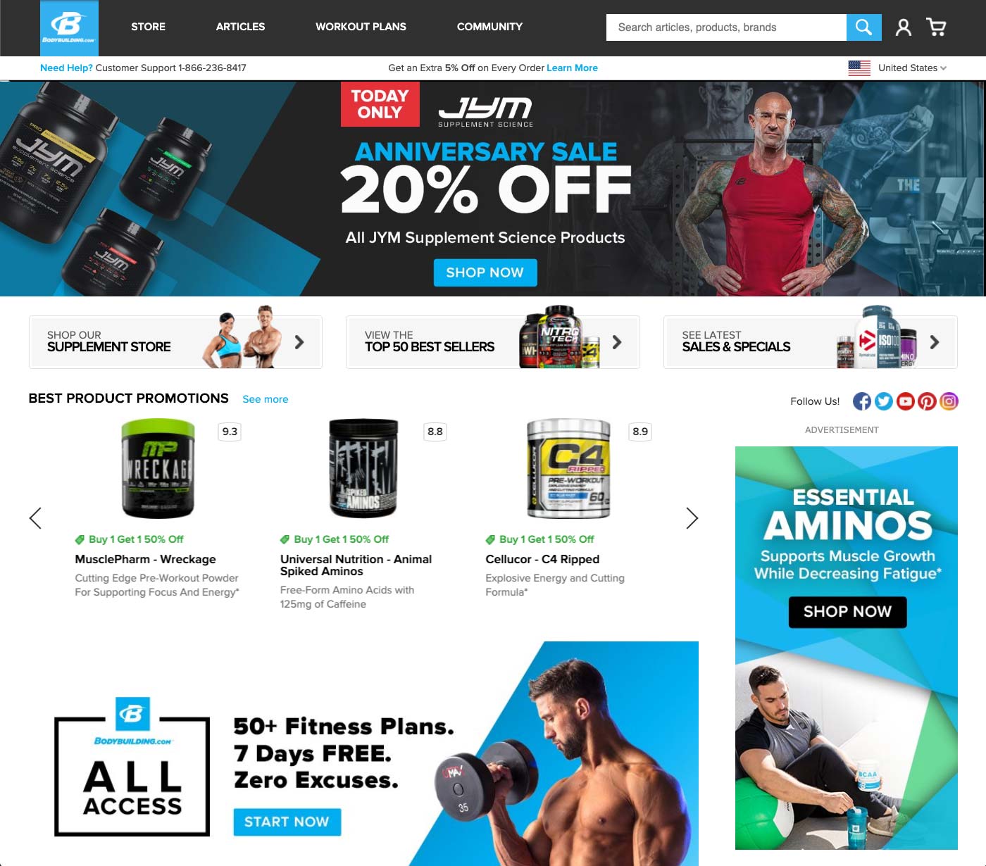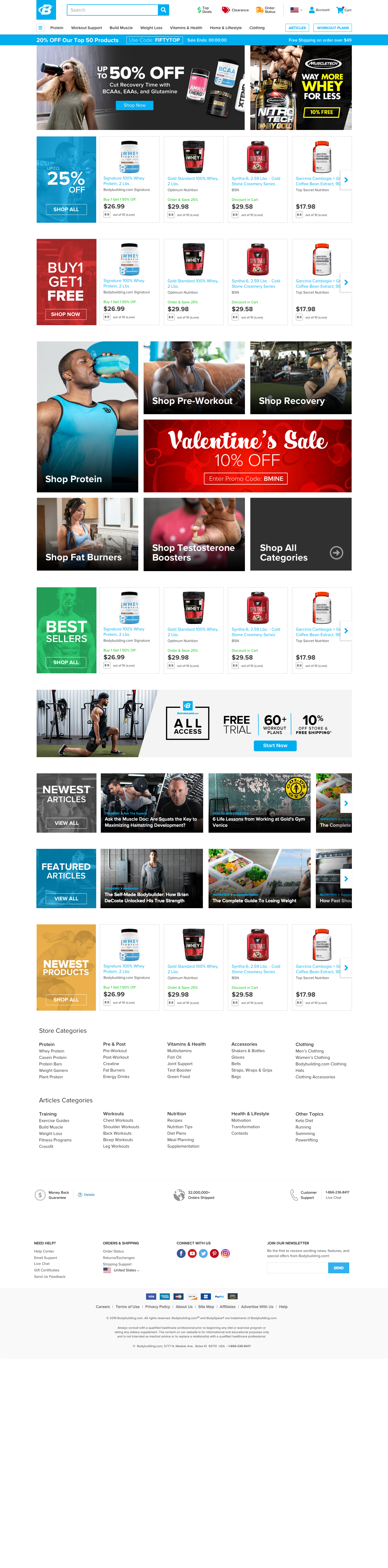 OVERVIEW: Bodybuilding.com aims to be a “total fitness solution”. It offers supplements, like protein, multivitamins, and energy drinks. While also offering over 12,000 free articles. It recently added a subscription model for premium workout programs. The homepage and navigation did not do a good job of showing all they offered. It also didn’t have very many opportunities for merchandizing to feature promotions or products.