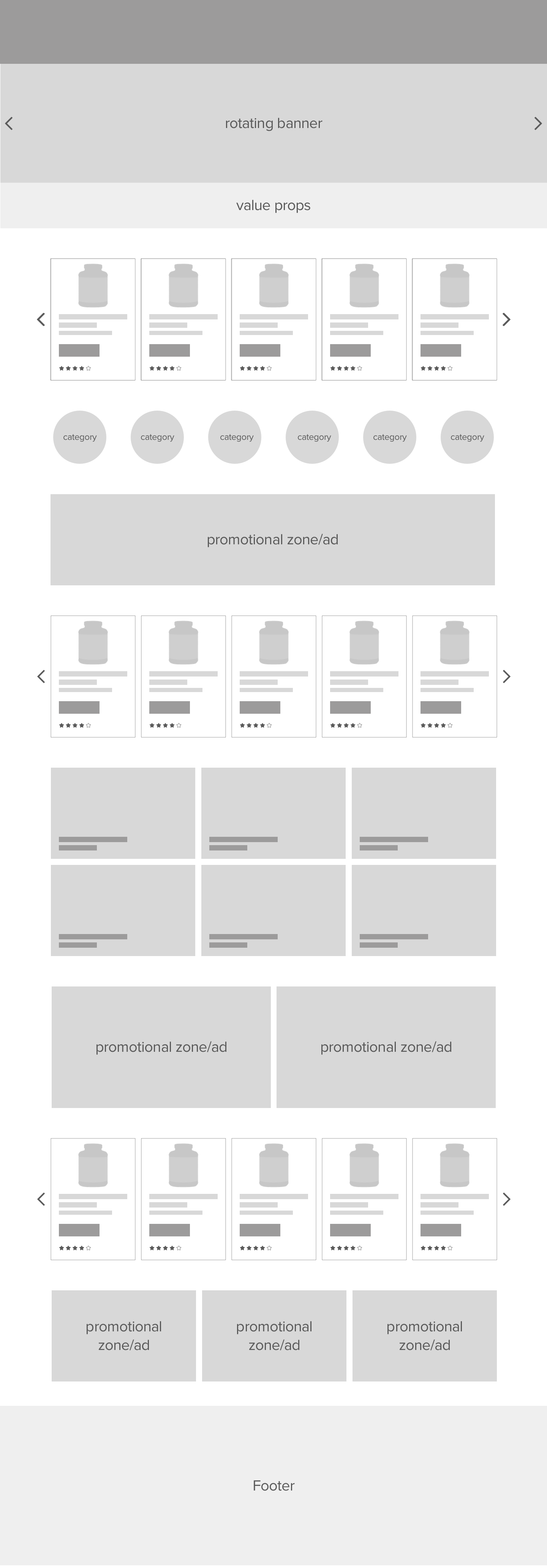 Most users on the homepage were going to 2 places: the Sales & Specials LP and a product category. Many users also used search from the homepage. However, those users that used search had a higher conversion rate than those that just were browsing. So we decided to focus on increasing conversion on browsers.