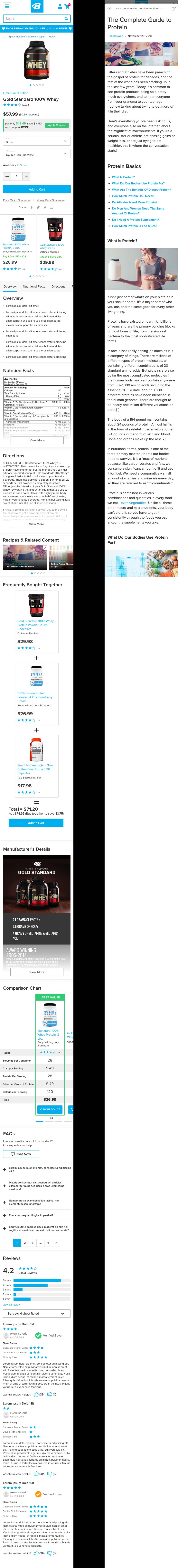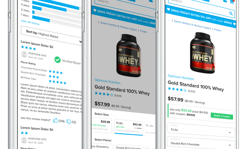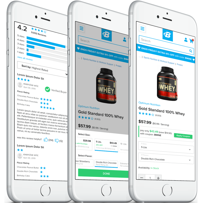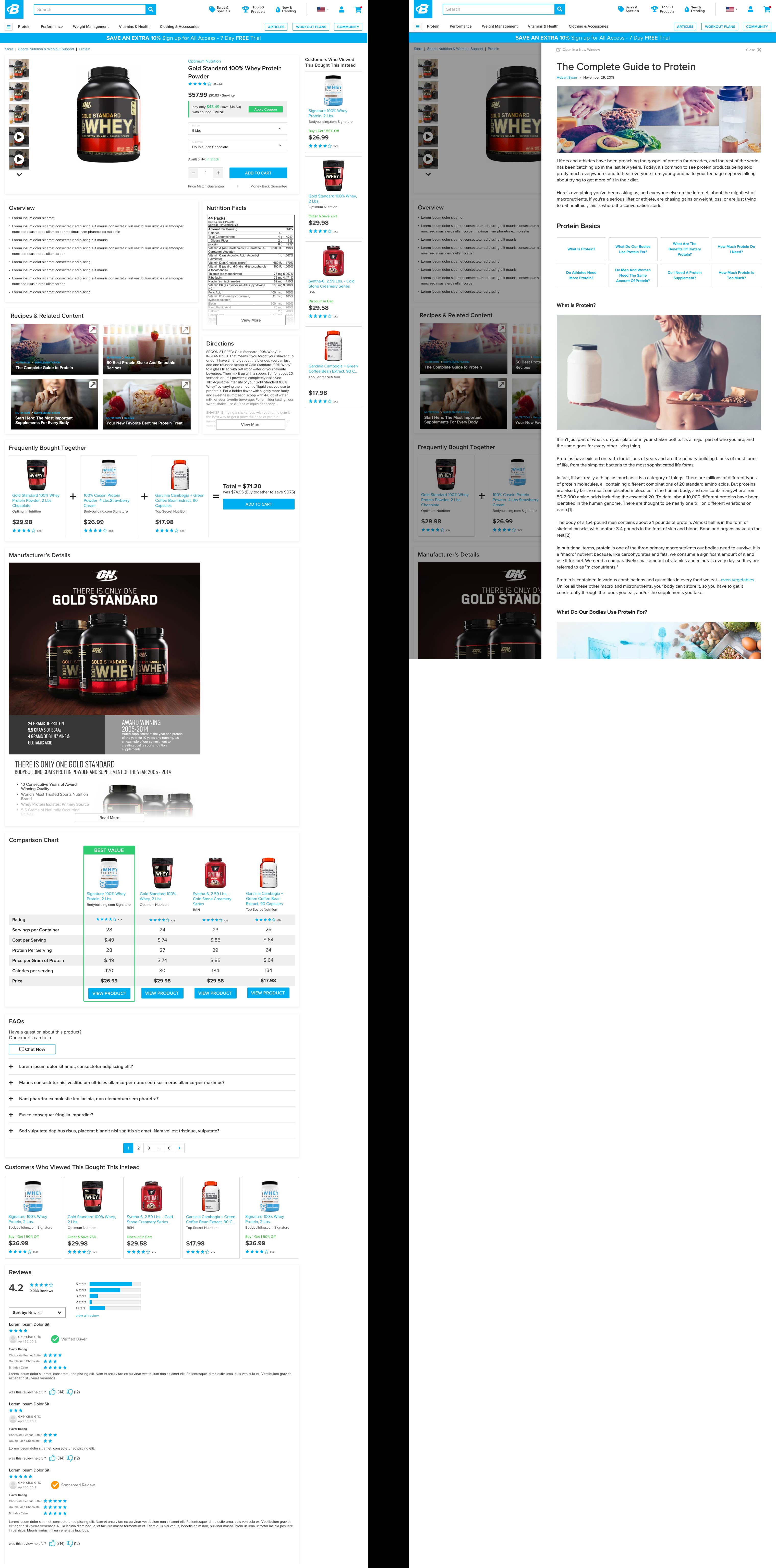 OVERVIEW: Bodybuilding.com’s Product Page was woefully out of date. It had numerous CTA buttons for each SKU on the product page. The goal of this project was to implement best practices for E-Commerce product page, while also, providing the ability to scale with new features such as, comparison tables, related content, coupon apply buttons, etc.
